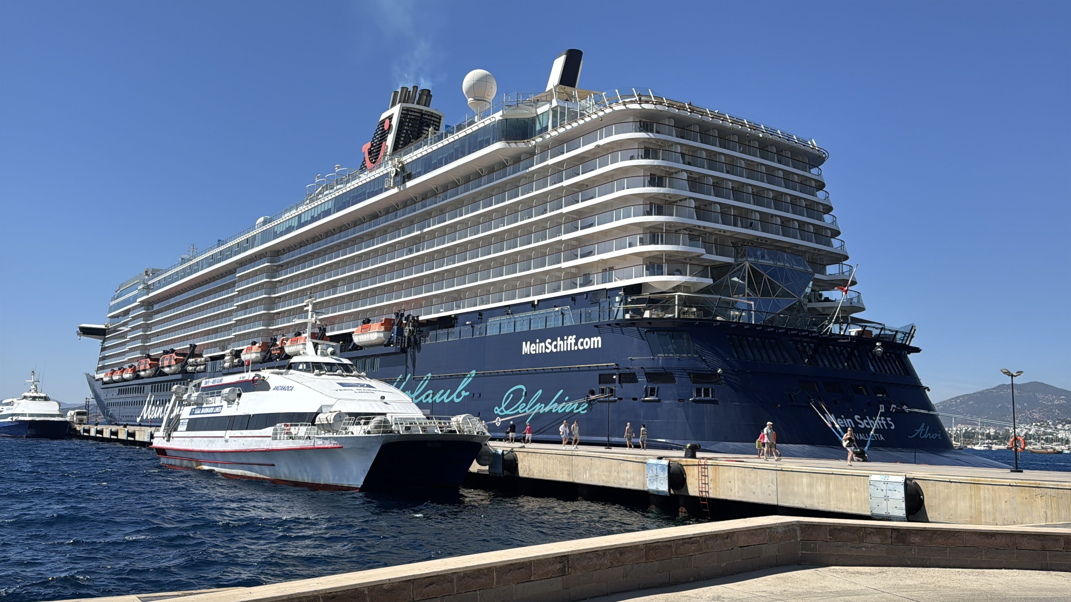 Türkiye’nin tatil cenneti ilçelerinden Muğla’nın Bodrum ilçesine “Mein Schiff 5” isimli Malta bayraklı kruvaziyer demirledi. Mikonos Limanı’ndan gelen kruvaziyerde çoğu Alman 2 bin 545 yolcu ve 923 personel bulunduğu öğrenildi.