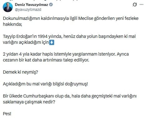 CHP Genel Başkan Yardımcısı Deniz Yavuzyılmaz, Cumhurbaşkanı Recep Tayyip Erdoğan’ın 1994 yılına ait mal varlığına ilişkin yaptığı açıklamalar nedeniyle 2 yıldan 4 yıla kadar hapis istemiyle yargılanmak istendiğini açıkladı. Yavuzyılmaz, söz konusu talebin cezanın artırılması yönünde ek bir istem de içerdiğini belirtti.