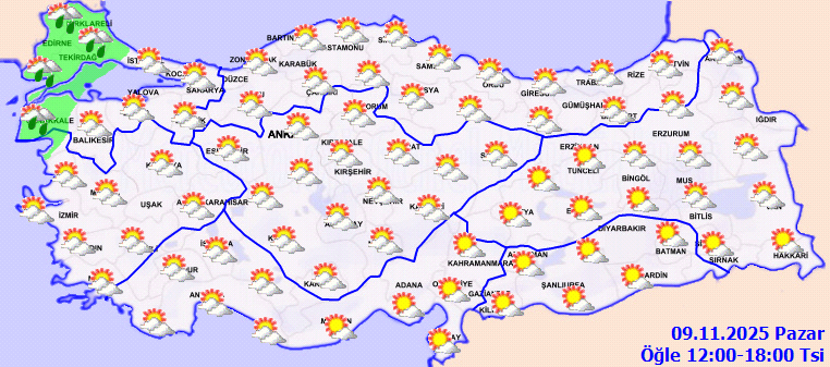 Meteoroloji Genel Müdürlüğü tarafından yapılan son tahminlere göre; yurdun kuzeybatı kesimleri parçalı yer yer çok bulutlu, Edirne, Kırklareli, Tekirdağ, Çanakkale çevreleri ile Balıkesir’in batı ilçelerinin aralıklı sağanak yağışlı, diğer yerlerin az bulutlu ve açık geçeceği tahmin ediliyor.